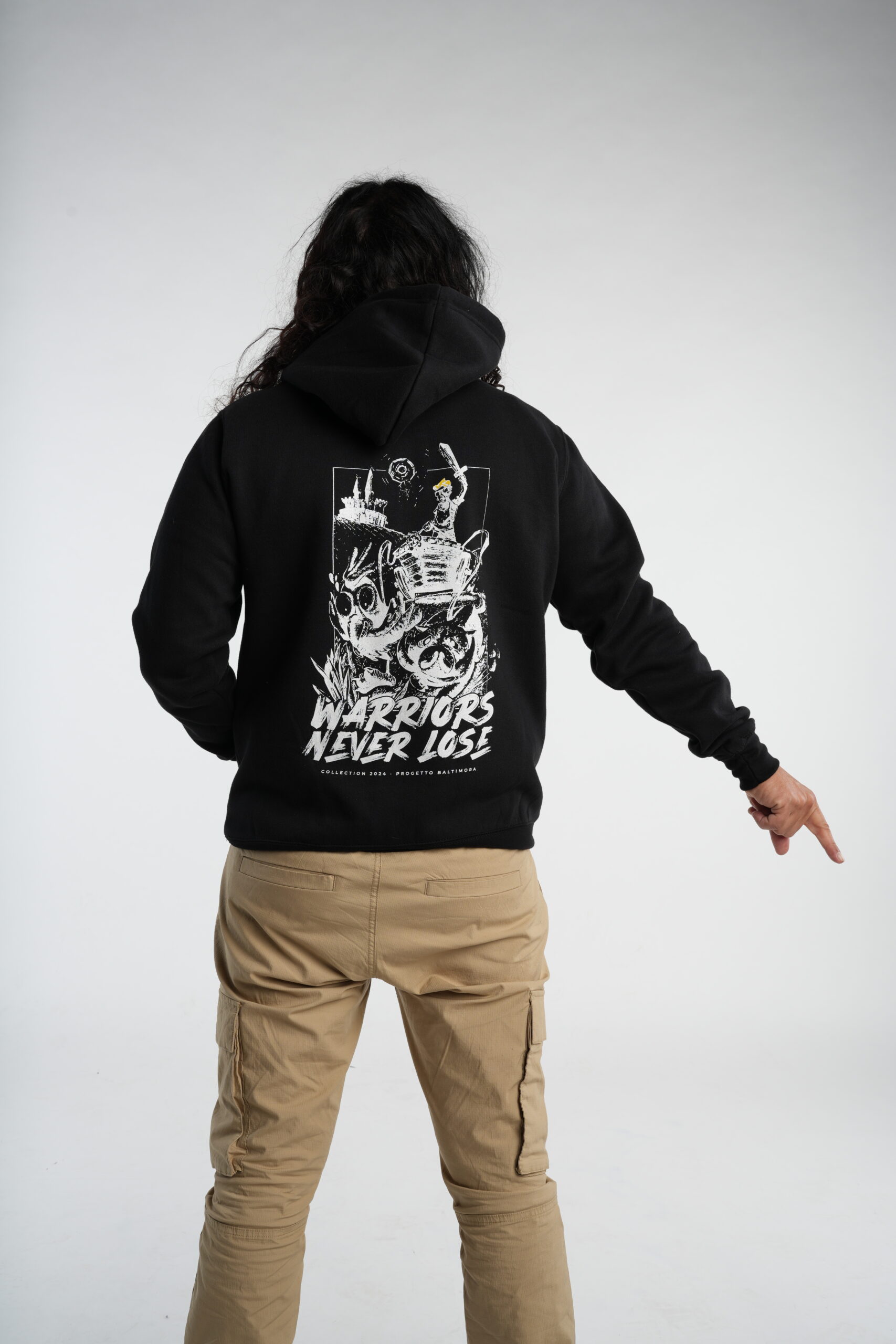 Rendi il tuo look inconfondibile con questa felpa nera con cappuccio, caratterizzata da una spettacolare stampa grafica bianca sul retro. Il design dal sapore urban-art raffigura dettagli dinamici e l’audace scritta “Warriors Never Lose”, simbolo di forza e spirito combattivo. Un capo perfetto per chi non teme di farsi notare.